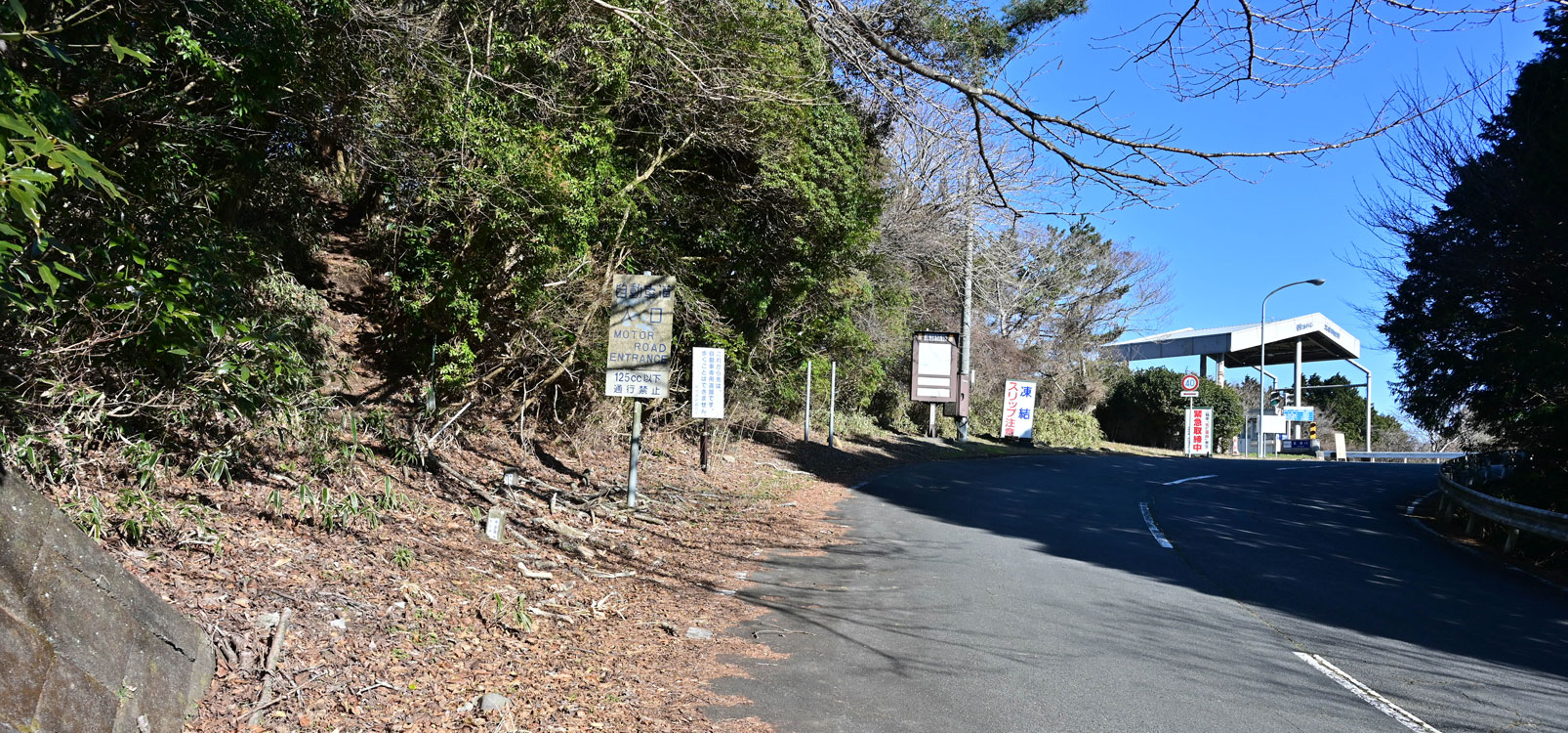 ここは伊豆スカイラインの玄岳インターチェンジの入口です。入口の手前に駐車場がありここから登山が始まります。登山口には標識がないので注意が必要で、この写真の左側に登山道らしきものが見えます。 なお、駐車場は伊豆スカイラインの中にもあり、駐車場からの眺めは玄岳山頂に見劣りしない風景が広がります。