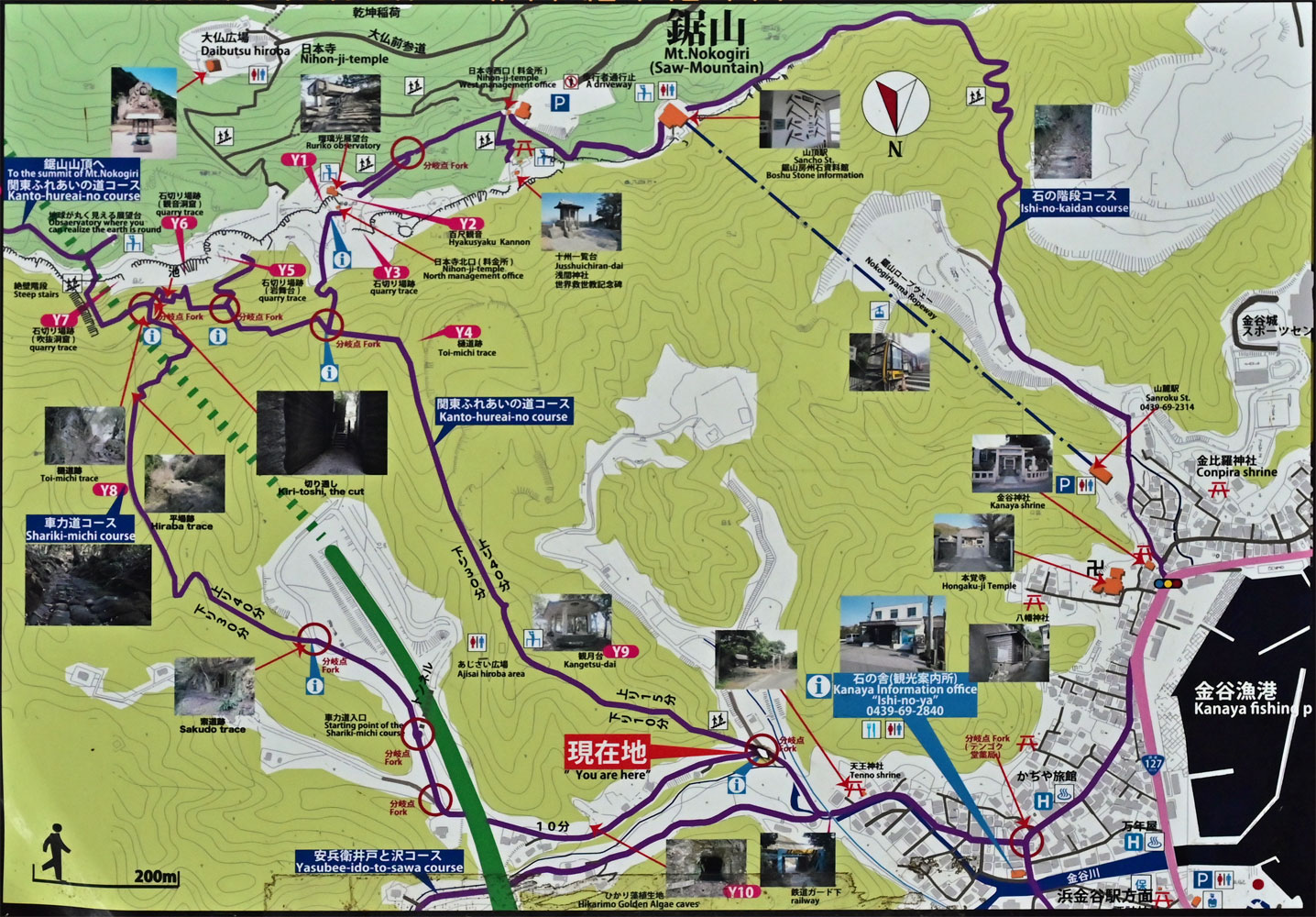 登山口にあるコース図ですが、石切り場や日本寺などの観光案内なので鋸山への登山ルートは明示されていません。 ルートの各分岐点にはルートを示す矢印はありますが、鋸山を示す表示は無くルートを間違えそうです。