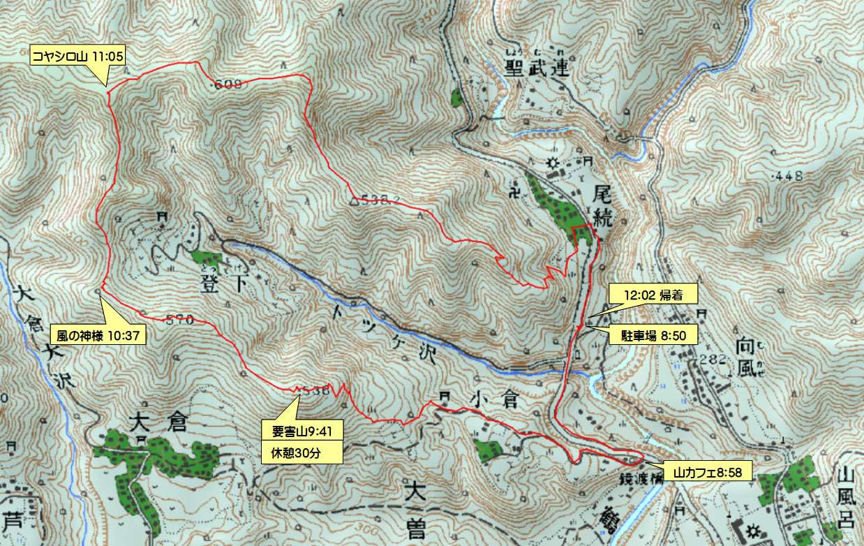 駐車場から要害山、風の神様、コヤシロ山までは見晴らしを楽しめますが、それ以降は樹林帯の中で黙々と下るだけです。